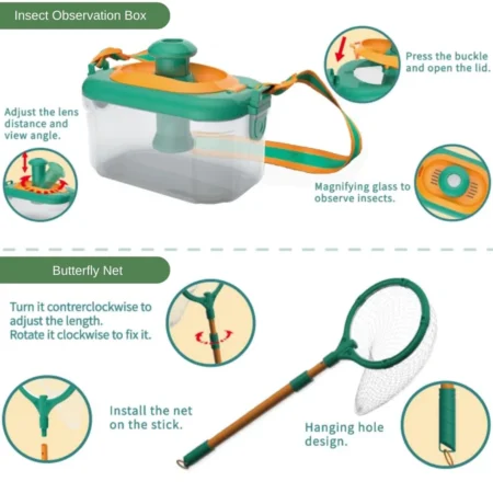 - 【Innovated Bug Catcher Kit】- Our nature toy kit provide kids the way to observe the insect, rocks, plants and the whole nature more clearly. The magnifying glass allows children to observe bugs closely. Featuring bug containers, a butterfly net, tweezers, a bug collector on common insects close to you, your boy or girl can study and keep track of all the bugs found in the grass.