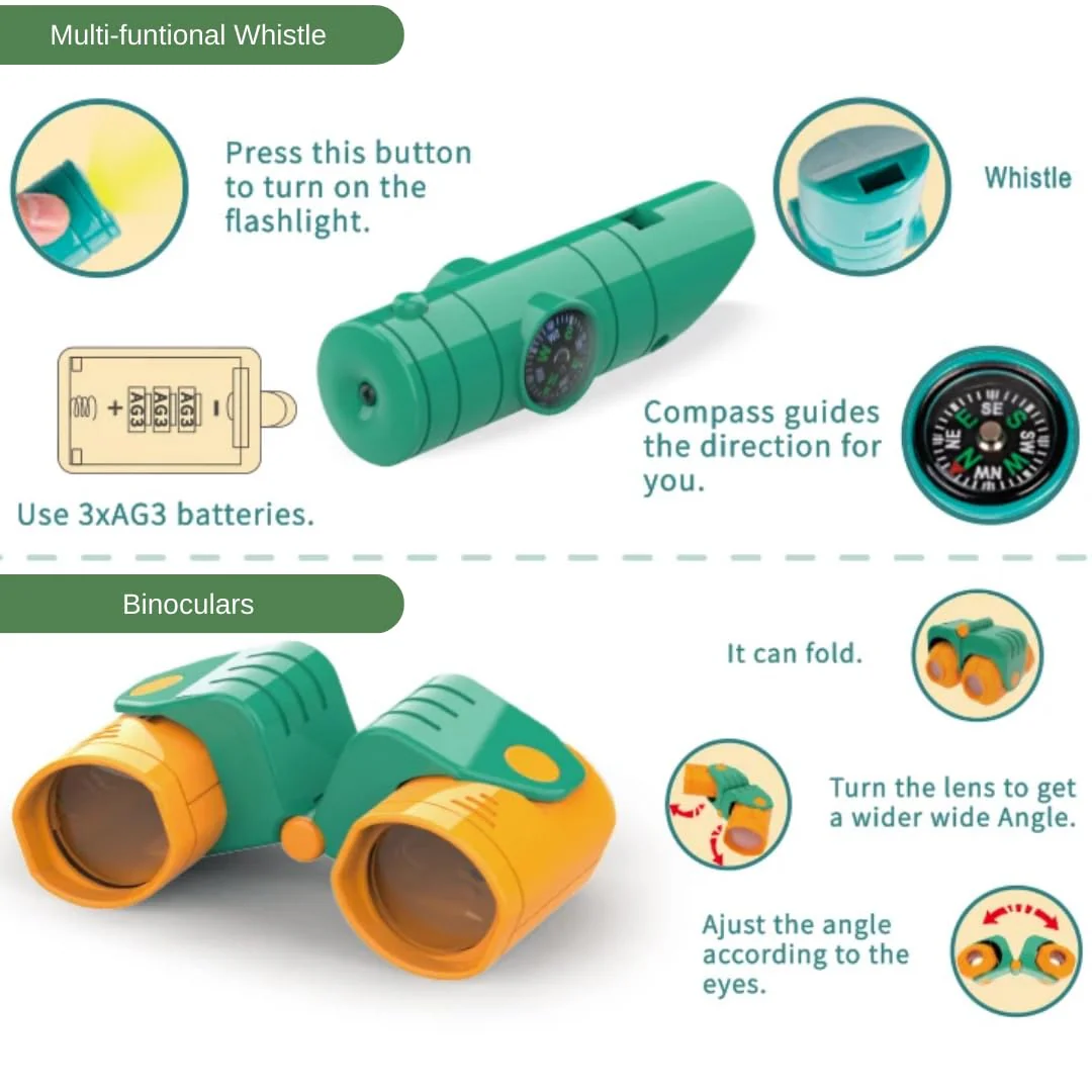 - 【Explorer & Discover with Your Kids】- Outdoor exploration kit is a great playing set for parents to enhance their relationship with children. The kids binoculars are 5×30 magnification for viewing nature up close with flexible rubber eye pieces protecting delicate eye area.