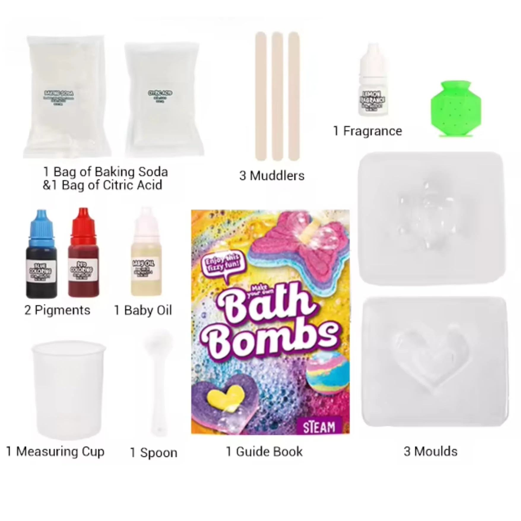 - COMPLETE KIT: Includes molds, pigments, citric acid, baking soda, fragrance, and more – just add baking soda and citric acid! The all-in-one set removes the hassle of sourcing individual ingredients and tools, making it easy to get started right away. The guide book offers tips and tricks to enhance your bath bomb making skills.