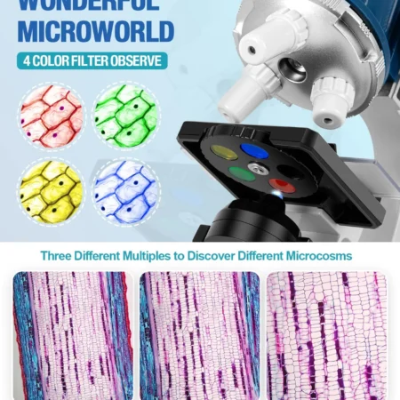 - GREAT SCIENCE EXPERIMENTS KITS – Forward-facing rotating turret provides 100x, 400x, and 1200x magnifications. Monocular viewing head with LED and mirror illumination and built-In color filter wheel to give transparent specimens extra definition. 2 AA batteries required(Not included)